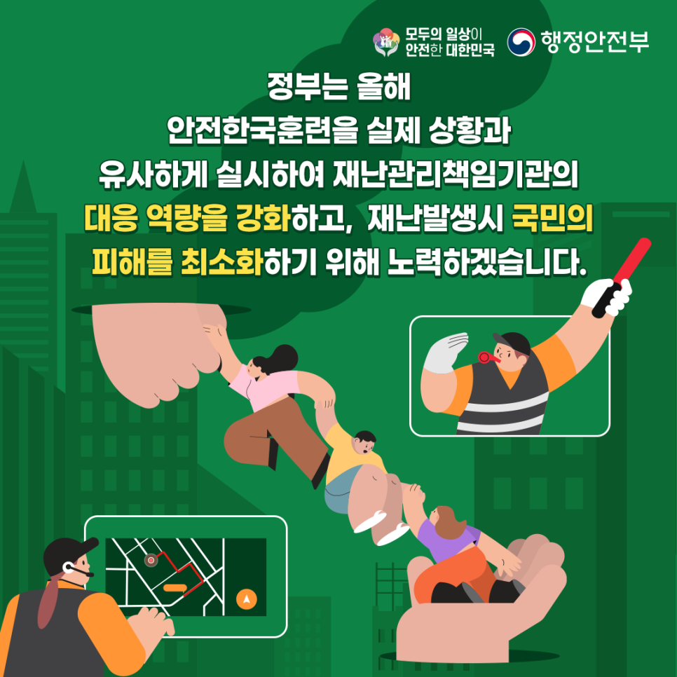 안전한국훈련은 행안부의 기본계획에 따라 중앙부처, 지방자치단체, 공공기관 등이 참여하여 범국가적으로 재난대응 역량을 점검하는 훈련입니다.