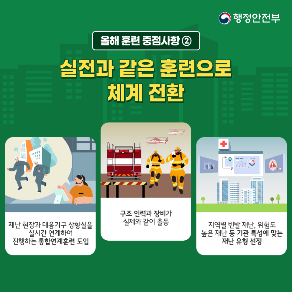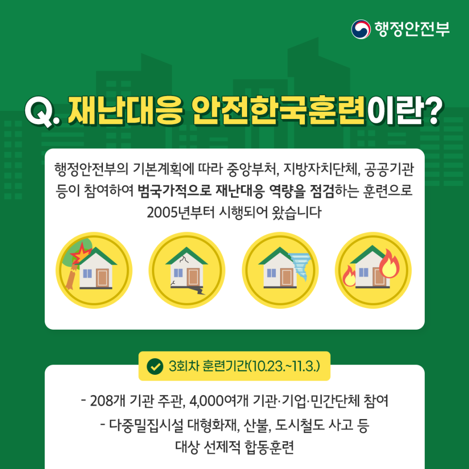 실전과 같은 훈련으로 안전한 대한민국 만들기위해 '2023년 안전한국훈련 3회차를 10월 23일  ~ 11월 3일까지 실시합니다.