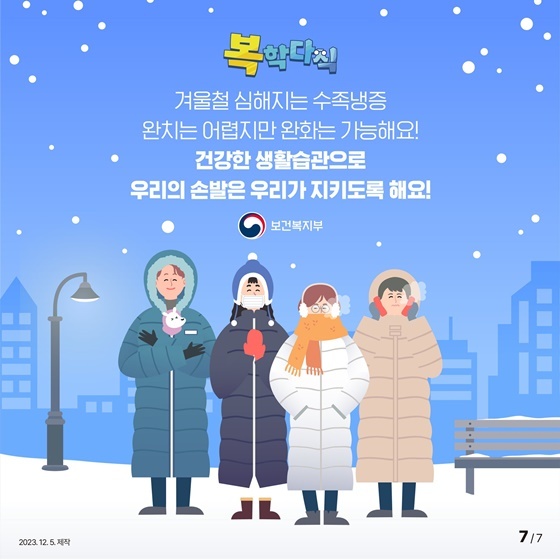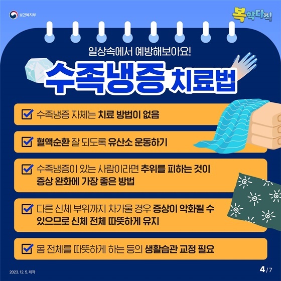 - 수족냉증이 있는 사람이라면 추위를 피하는 것이 증상 완화에 가장 좋은 방법
