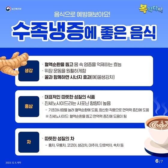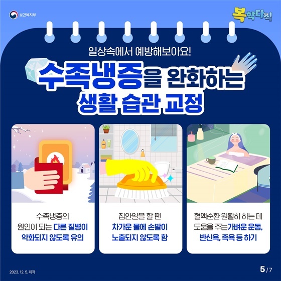 - 다른 신체 부위까지 차가울 경우 증상이 악화될 수 있으므로 신체 전체 따뜻하게 유지