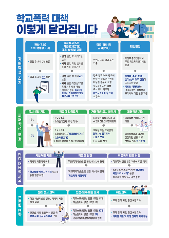 학교폭력 2차 가해를 차단하기 위해 2차 가해 시 6호 이상 처분(출석 정지, 학급교체, 전학, 퇴학)을 하도록 했다. 가해 학생은 조치사항 대입 수시 정시에 반영한다고 한다.