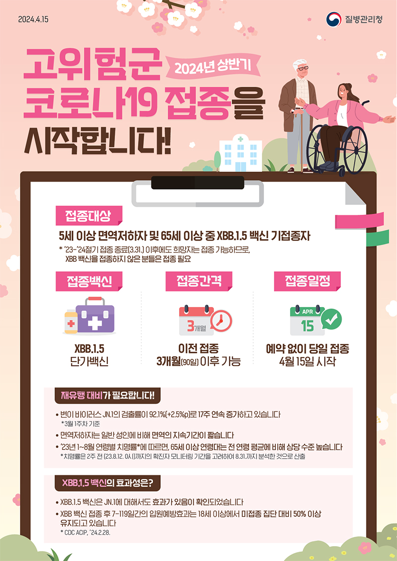 코로나19 상반기 예방접종은 5세 이상 면역저하자와 65세 이상 중 2023-2024절기 XBB.1.5 백신을 접종한 사람을 대상으로 한다.