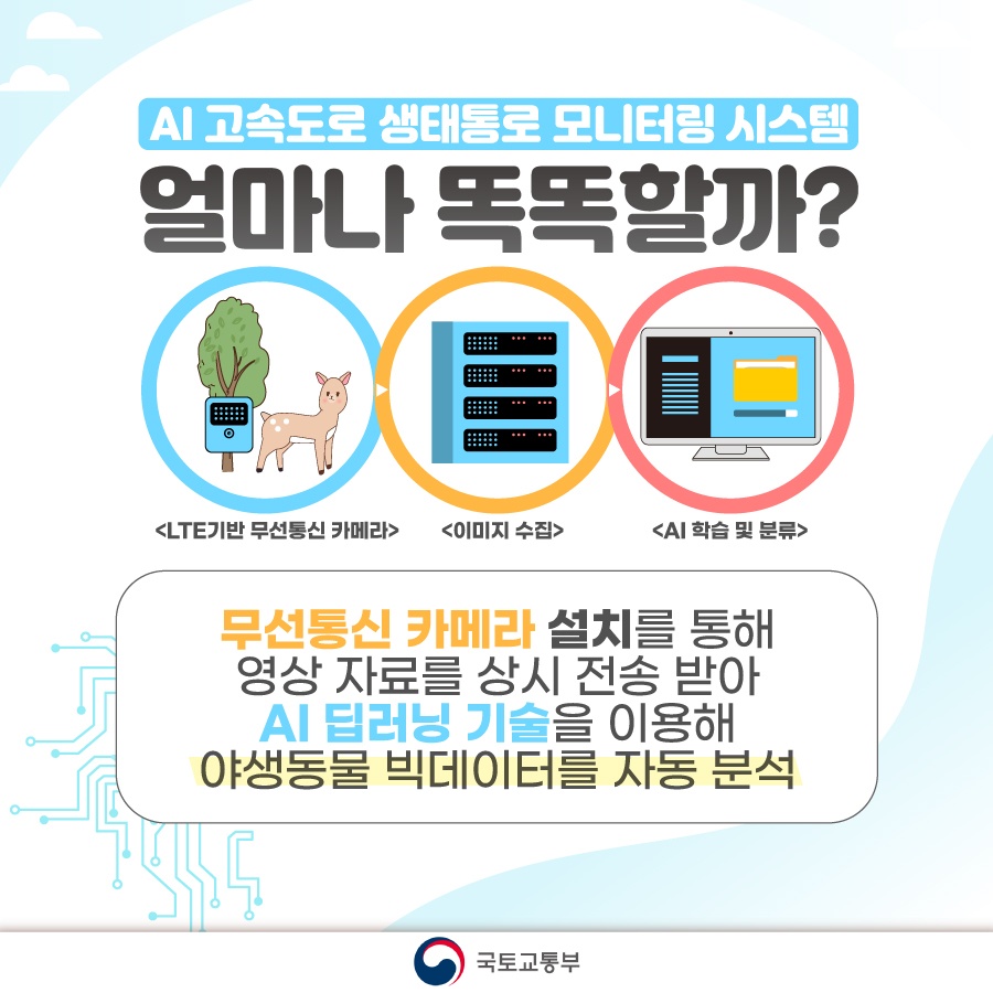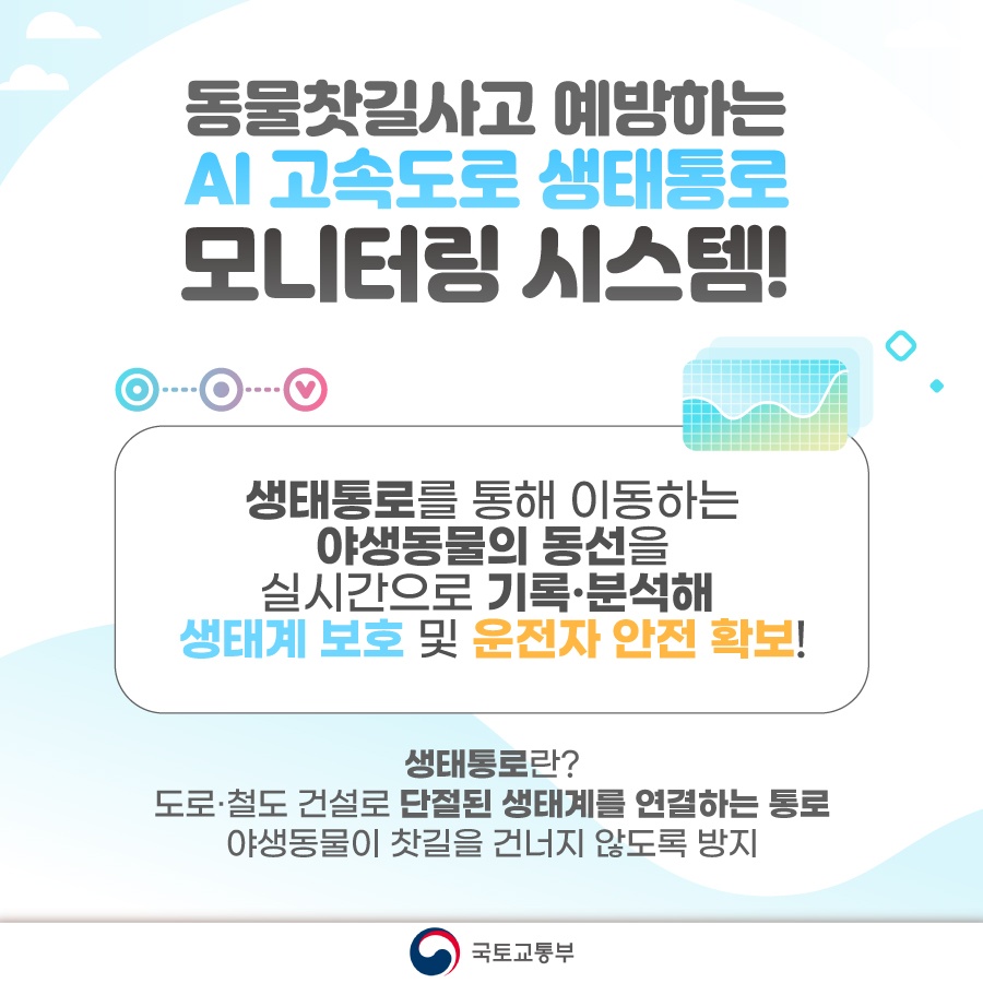 봄철 급증하는 동물찻길사고, 이젠 AI로 운전자의 안전도 지키고, 자연생태계도 보호할 수 있습니다. AI에 기반해 작동하는 고속도로 생태통로 모니터링 시스템을 카드뉴스를 통해 알아보세요!