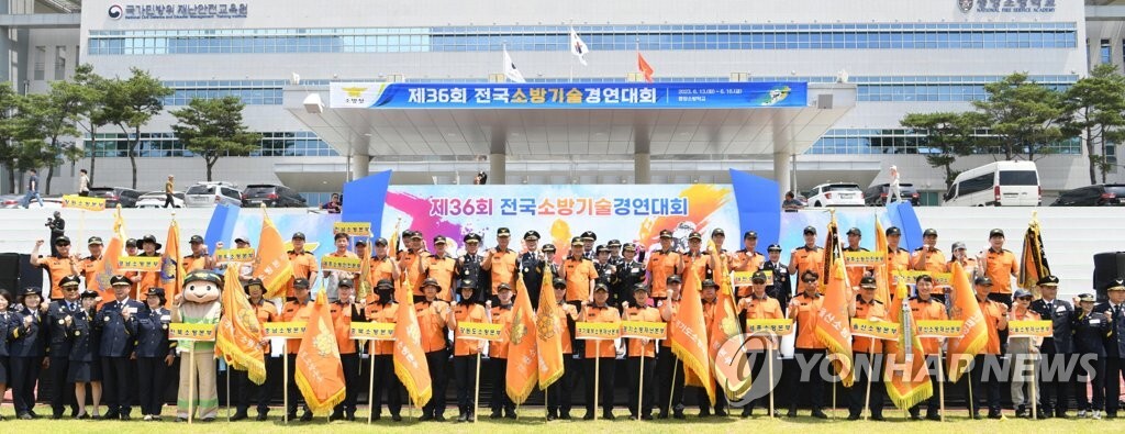 (출처 : 서울=연합뉴스) 남화영 소방청장이 13일 충남 공주시 중앙소방학교에서 열린 제36회 전국 소방기술 경연대회에서 시·도 선수단과 기념 촬영하고 있다.
