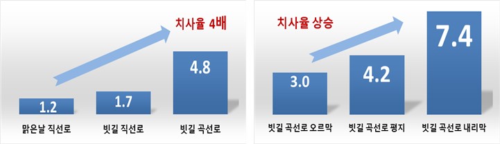 빗길 곡선로에서 발생한 사고의 치사율은 4.8(명/100건)로 맑은날 직선로 1.2(명/100건)보다 네 배 높았고, 특히 빗길 곡선로 내리막구간에서의 치사율은 7.4(명/100건)로 매우 높은 것으로 분석됐다.
