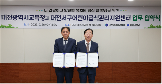 대전광역시 교육청 (교육감 설동호)은 지난26일 더 건강하고 안전한 유치원 급식을 위해 배재대학교와 유치원급식협력체계구축지원사업을 위해 업무협약을 체결했다고 밝혔다.
