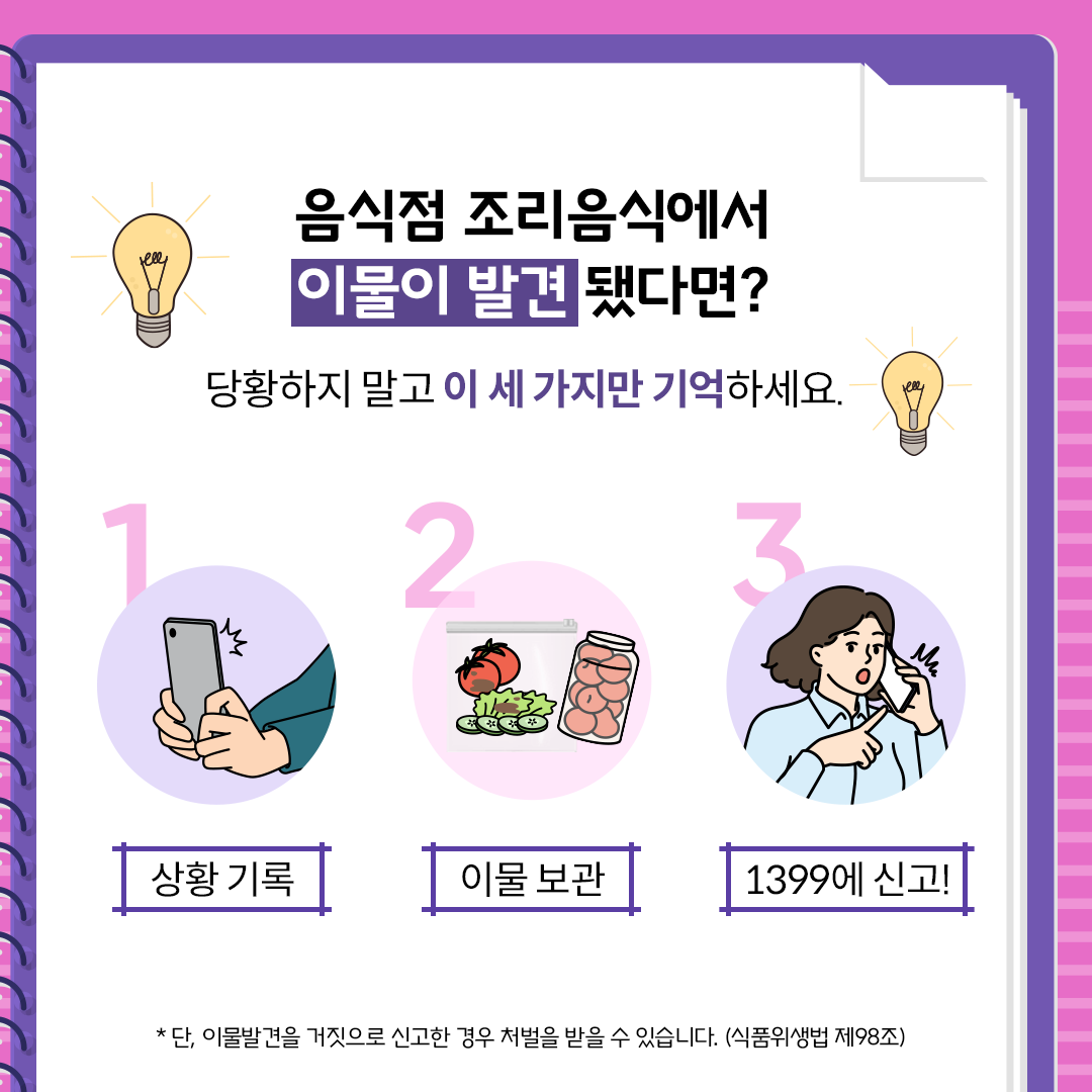 * 단, 이물 발견을 거짓으로 신고한 경우 처벌을 받을 수 있다(식품위생법 제98조).