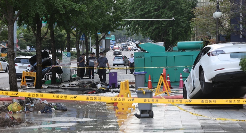 지난해 서울 강남역 인근 한 빌딩에서 배수 작업이 진행되고 있다. 도시침수방지법은 우선 기존의 통상적인 홍수 대책만으로는 피해 예방이 어려워 침수 피해가 발생했 거나 피해가 우려되는 지역을 대상으로 국가가 직접 10년 주기의 특정도시하천 침수피해방지 기본 계획을 수립하도록 했다.