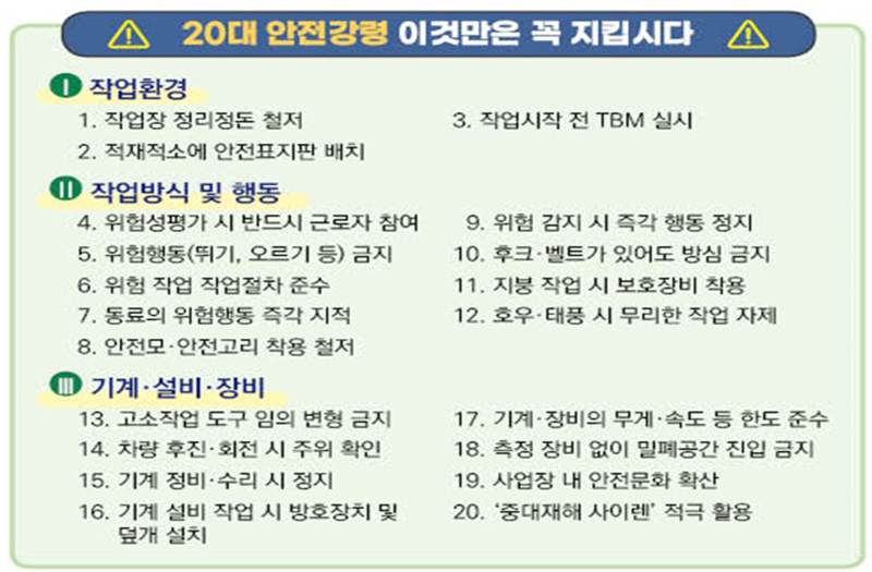 특히 추석 연휴기간에는 사업장의 사고 동향을 면밀히 모니터링해 신속 대응하기 위해 본부-지방노동관서-안전보건공단 비상대응체계도 운영할 방침이다.