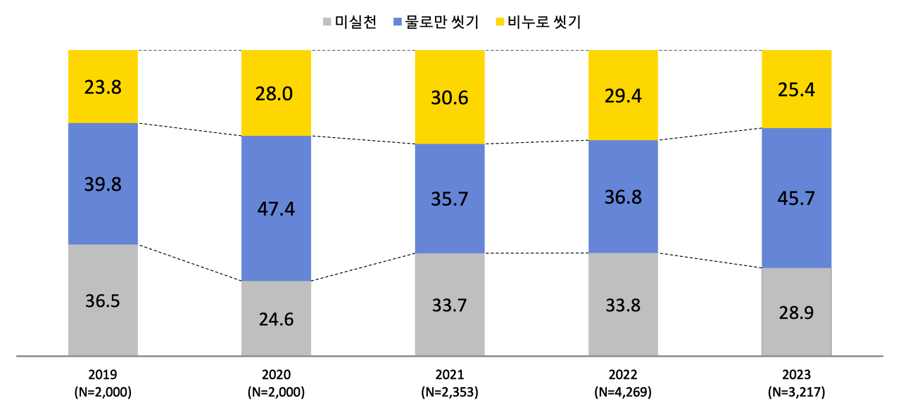** (’22)5.9%→(’23)11.2%, 흐르는 물에 비누로 30초 이상 손을 씻은 경우