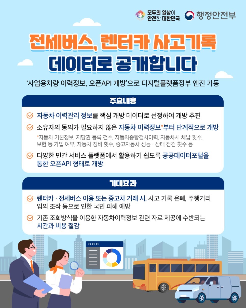 이번 사업은 개방 시 국가적 차원에서 파급효과가 높은 고수요의 데이터에 대한 개방을 지원하는 국가중점데이터 개방사업의 일환으로 추진되며, 사업용 차량에 대한 이력정보 개방으로 국민들이 렌터카나 전세버스를 이용하거나 중고차 거래를 할때 사고기록 은폐, 주행거리 임의 조작 등으로 인해 받을 수 있는 피해를 미연에 방지할 수 있을 것으로 기대됩니다.