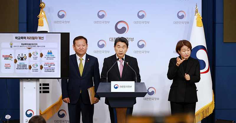 정부는 아이들이 자유롭고 공정하게 교육받는 기본권을 침해하는 학교폭력의 위협에서 벗어나 안전한 환경에서 공부하고, 학교 현장에서는 교권이 바로 설 수 있도록 질서 있는 학교 조성을 위해 최선을 다하겠다고 밝혔다.