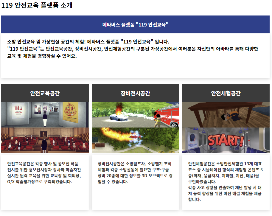 | 소방청 | 사회적 거리두기로 인해 체험 위주의 화재, 응급구조 교육 운영이 어려운 상황에서도 온라인 체험교실, 메타버스 119 안전교육 프로그램 등을 통해 중단없이 대국민 안전교육을 진행 |