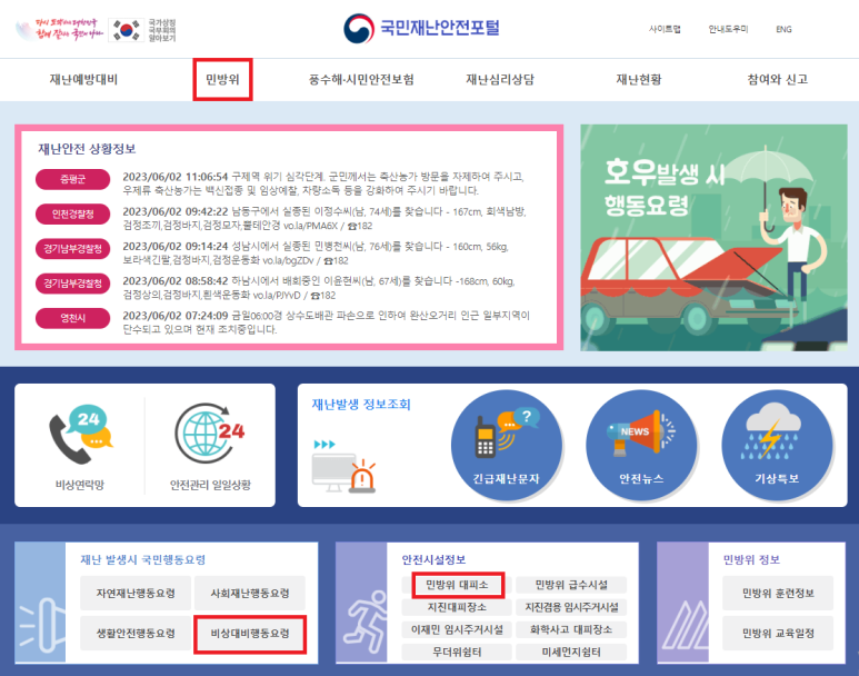 위급 상황에 당황하지 않도록 사전에 우리 동네 대피소는 어디에 있는지 어떻게 가야하는지 알아두는것이 좋습니다. 대피소는 국민재난안전포털 홈페이지나 안전디딤돌 앱에서 찾아볼 수 있는데요. 국민재난안전포털과 안전디딤돌앱에서 <우리동네 대피소> 찾는 방법을 알려드리겠습니다.