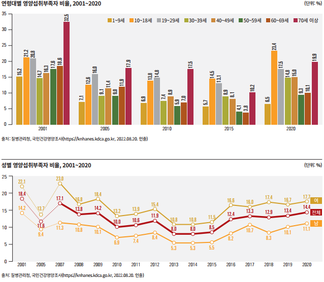 남녀는 식생활이나 식습관이 다르기 때문에 영양섭취 수준에도 차이를 보인다. 2001년부터 2020년까지 여성의 영양섭취부족자 비율이 남성보다 꾸준히 높다.