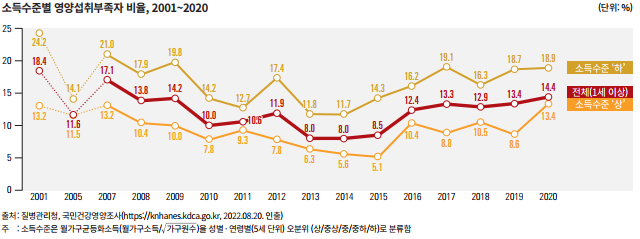 2001년부터 2020년까지 전 기간에 걸쳐 소득수준이 낮은 집단이 높은 집단에 비해 영양섭취부족자 비율이 높다. 2020년만 보더라도 고소득층에서는 영양섭취부족자 비율이 13.4%인 반면, 저소득층에서는 18.9%에 이른다.
