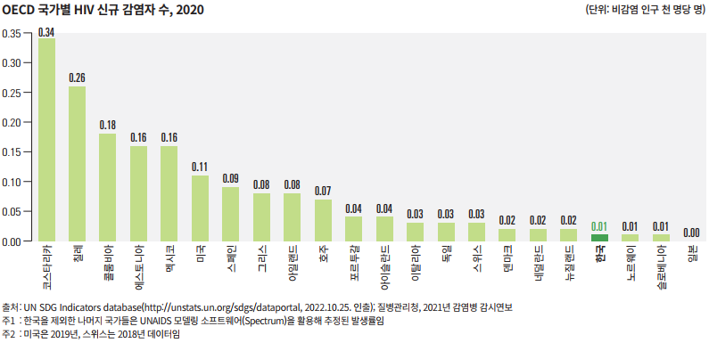한국의 인구 1000명당 HIV 신규 감염자 수는 2021년 기준 0.0149명으로 OECD 국가 중 매우 낮은 수준이다.