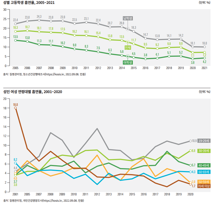 청소년(고등학생)의 흡연 역시 2005년 이후 지속적으로 감소하고 있다. 남학생의 경우 2005년 22.4%에서 2021년 10.0%로 감소했고 같은 기간 여학생도 13.5%에서 4.2%로 감소했다. 남학생과 여학생 모두 절반 아래로 줄어든 것이다. 다만 여학생의 흡연율은 2016년부터 뚜렷한 감소 추세를 보이지 않고 있어 성인 여성의 흡연율과 마찬가지로 정체 상태에 있음을 알 수 있다. 더욱이 19~29세 여성의 흡연율이 성인 여성 전체에 비해 높을 뿐 아니 라 2015년 이후 증가 추세를 보이고 있다. 정체 중인 여성 흡연율 감소를 위해서는 20대 성인 여성과 청소년에 대한 개입이 중요한 상황이다.